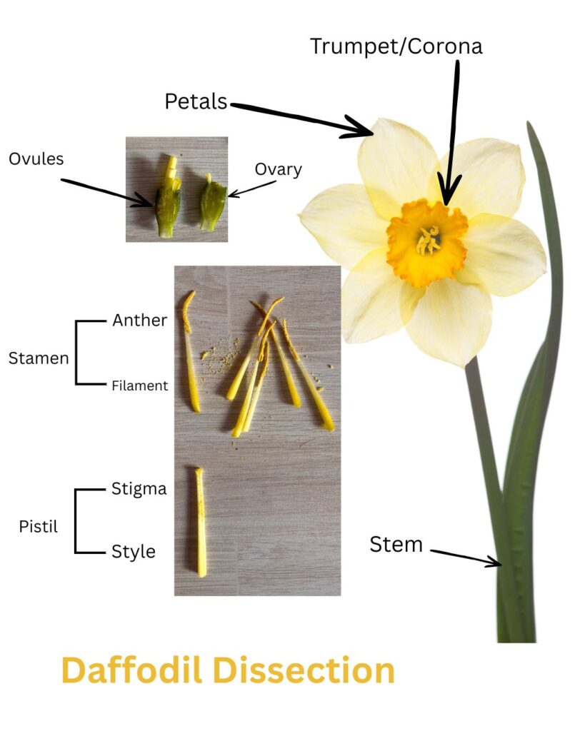 Once you've identified the different parts of a daffodil, choose another flower and try to find them again.