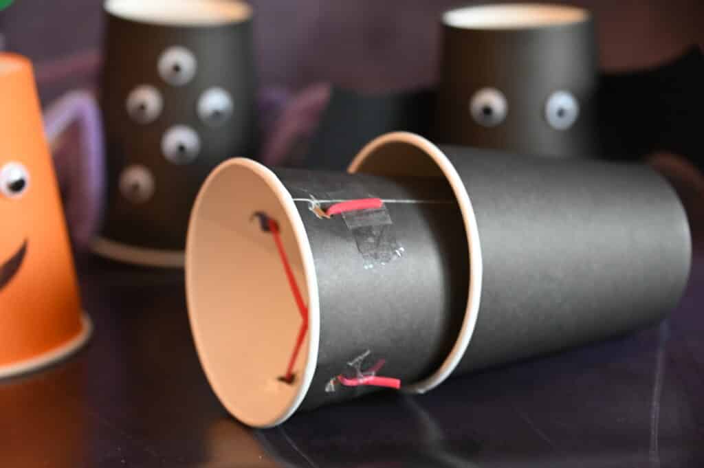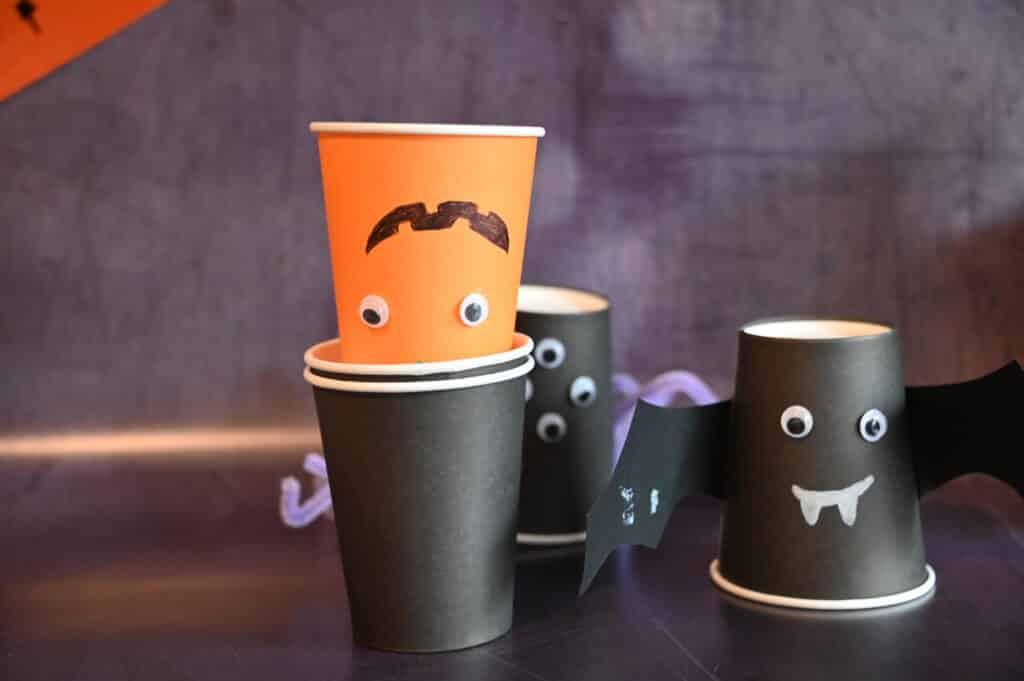 Decorate a second paper cup to look like a bat or other Halloween theme.