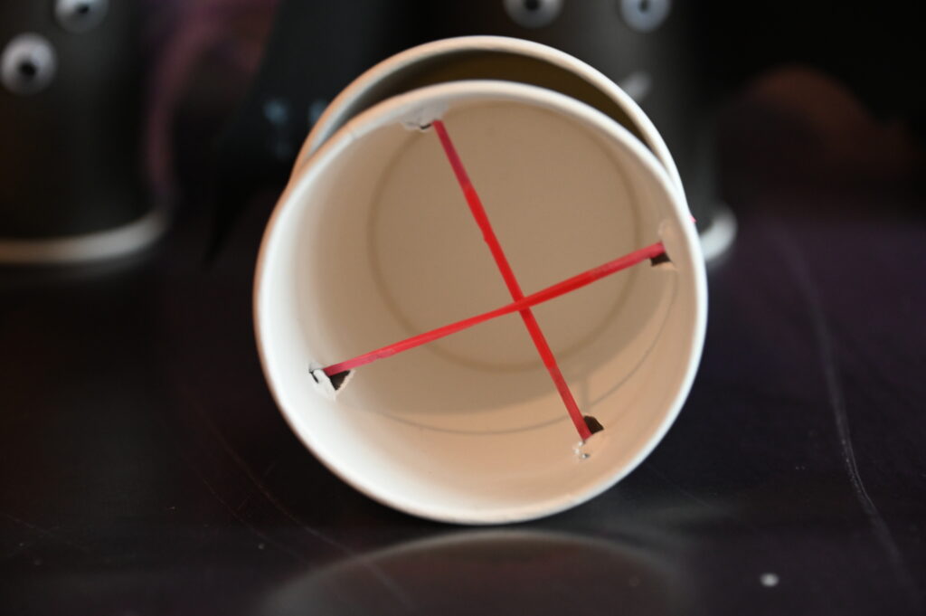 Thread the elastic bands through the holes in the cup as shown and secure the ends with tape. This is the mechanism that will catapult the paper cup bats into the air. Put this cup inside another cup (this is just so it looks better and is not necessary).