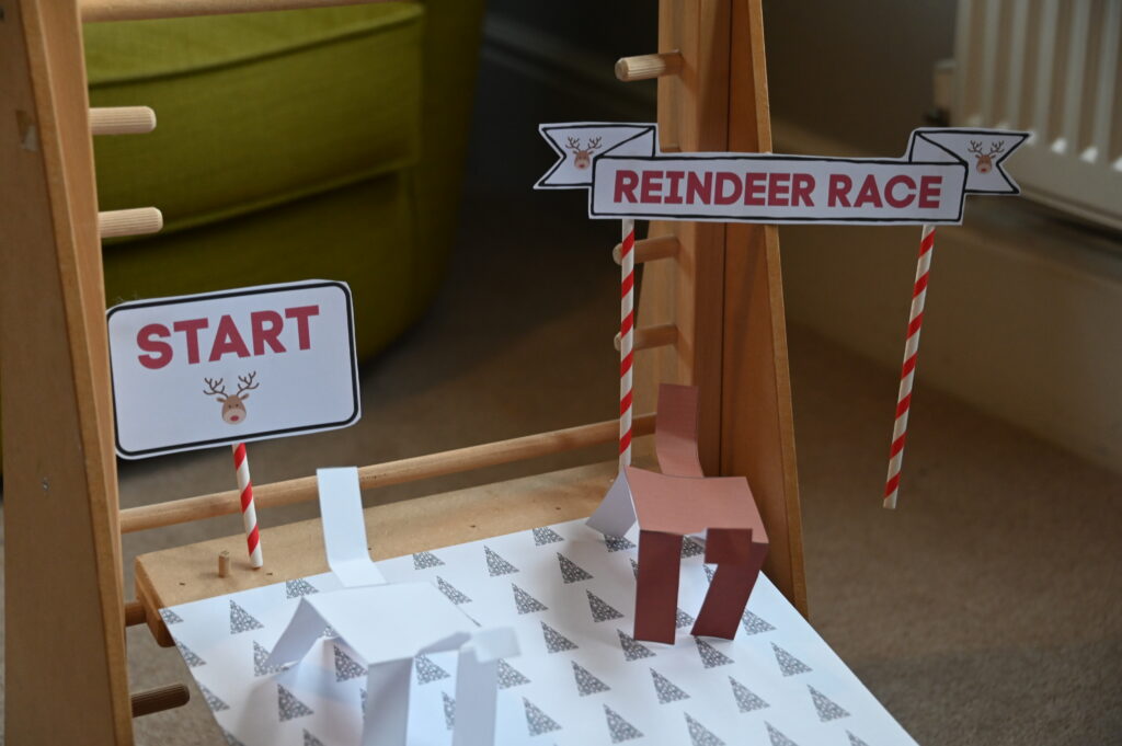 Set up a ramp from a stack of books and thick cardboard, and place the reindeer at the top.